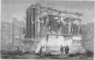 Having examined the great temple, and tested the curvature of its seemingly horizontal lines by sighting along the unencumbered platform, and having stopped at several points of the grand portico to admire the fine views of the city and surrounding country, the traveler picks his way northward, across a thick layer of fragments of columns, statues and blocks of marble, toward the low-placed, irregular but elegant Erechtheum, the temple of the most ancient worship and statue of the patron-goddess of the city. This building sits close by the northern as the Parthenon does by the southern wall of the enclosure. It has suffered equally with the other from the ravages of time, and its ruins, though less grand, are more beautiful. Most of the graceful Ionic columns are still standing, but large portions of the roof and entablature have fallen. Fragments of decorated cornice strew the ground, some of them of considerable length, and afford a near view of that delicate ornamentation and exquisite finish so rare outside the limits of Greece. The elevated porch of the Caryatides, lately restored by the substitution of a new figure in place of the missing statue now in the British Museum, attracts attention as a unique specimen of Greek art, and also as showing how far a skillful treatment will overcome the inherent difficulties of a subject. The row of fair maidens looking out toward the Parthenon do not seem much oppressed by the burden which rests upon them, while their graceful forms lend a pleasing variety to the scene. Passing out by the northern wing of the Propylaea, a survey is had of the numerous fragments of sculpture discovered among the ruins upon the hill, and temporarily placed in the ancient Pinacotheca. The eye rests upon sweet infant faces and upon rugged manly ones. Sometimes a single feature only remains, which, touched by the finger of genius, awakens admiration. A naked arm severed from the trunk, of feminine cast, but with muscles tightly strained and hand clenched as in agony, will arrest attention and dwell in the memory.