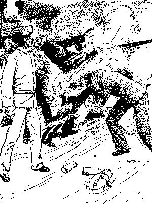 The Irish fireman attempted to wrench himself free, then he struck out at "Hod" with all the force of his right arm. The quarter-back's practice on the field came into play, and the college graduate tackled his opponent in the latest approved style. The struggle was short and decisive, and it resulted in Burke declaring his willingness to return to the ship.