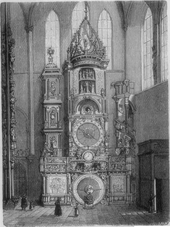Many years ago there lived here an aged and experienced mechanic. Buried in his arts, he forgot the ways of the world, and promised his daughter to his gallant young apprentice, instead of to the hideous old magistrate who approached the maiden with offers of gold and dignity. One day the youth and damsel found the unworldly artist weeping for joy before his completed clock, the wonder of the earth. Everybody came to see it, and the corporation bought it for the cathedral. The city of Basel bespoke another just like it. This order aroused the jealousy of the authorities, [pg 372] who tried to make the mechanic promise that he would never repeat his masterpiece for another town. "Heaven gave me not my talents to feed your vain ambition," said the man of craft: "the men of Basel were quicker to recognize my skill than you were. I will make no such promise." Upon that the rejected suitor, who was among the magistrates, persuaded his colleagues to put out the artist's eyes. The old man heard his fate with lofty fortitude, and only asked that he might suffer the sentence in the presence of his darling work, to which he wished to give a few final strokes. His request was granted, and he gazed long at the splendid clock, setting its wonders in motion to count off the last remaining moments of his sight. "Come, laggard," said the persecuting magistrate, who had brought a crowd of spectators, "you are taxing the patience of this kind audience." "But one touch remains," said the old mechanic, "to complete my work;" and he busied himself a moment among the wheels. While he suffered the agonies of his torture a fearful whir was heard from the clock: the weights tumbled crashing to the floor as his eyes fell from their sockets. He had removed the master-spring, and his revenge was complete. The lovers devoted their lives to the comfort of the blind clockmaker, and the wicked magistrate was hooted from society. The clock remained a ruin until 1842, when parts of it were used in the new one constructed by Schwilgué.