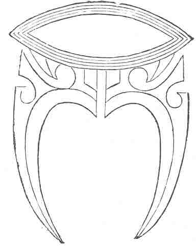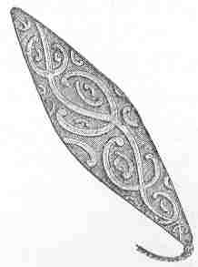 The instrument which produces the sounds that warn women to remain afar is a toy familiar to English country lads.  They call it the bull-roarer.  The common bull-roarer is an inexpensive toy which anyone can make.  I do not, however, recommend it to families, for two reasons.  In the first place, it produces a most horrible and unexampled din, which endears it to the very young, but renders it detested by persons of mature age.  In the second place, the character of the toy is such that it will almost infallibly break all that is fragile in the house where it is used, and will probably put out the eyes of some of the inhabitants.  Having thus, I trust, said enough to prevent all good boys from inflicting bull-roarers on their parents, pastors, and masters, I proceed (in the interests of science) to show how the toy is made.  Nothing can be less elaborate.  You take a piece of the commonest wooden board, say the lid of a packing-case, about a sixth of an inch in thickness, and about eight inches long and three broad, and you sharpen the ends.  When finished, the toy may be about the shape of a large bay-leaf, or a ‘fish’ used as a counter (that is how the New Zealanders make it), or the sides may be left plain in the centre, and only sharpened towards the extremities, as in an Australian example lent me by Mr. Tylor.  Then tie a strong piece of string, about thirty inches long, to one end of the piece of wood and the bull-roarer (the Australian natives call it turndun, and the Greeks called it ρομβος) is complete.  Now twist the end of the string tightly about your finger, and whirl the bull-roarer rapidly round and round.  For a few moments nothing will happen.  In a very interesting lecture delivered at the Royal Institution, Mr. Tylor once exhibited a bull-roarer.  At first it did nothing particular when it was whirled round, and the audience began to fear that the experiment was like those chemical ones often exhibited at institutes in the country, which contribute at most a disagreeable odour to the education of the populace.  But when the bull-roarer warmed to its work, it justified its name, producing what may best be described as a mighty rushing noise, as if some supernatural being ‘fluttered and buzzed his wings with fearful roar.’  Grown-up people, of course, are satisfied with a very brief experience of this din, but boys have always known the bull-roarer in England as one of the most efficient modes of making the hideous and unearthly noises in which it is the privilege of youth to delight.