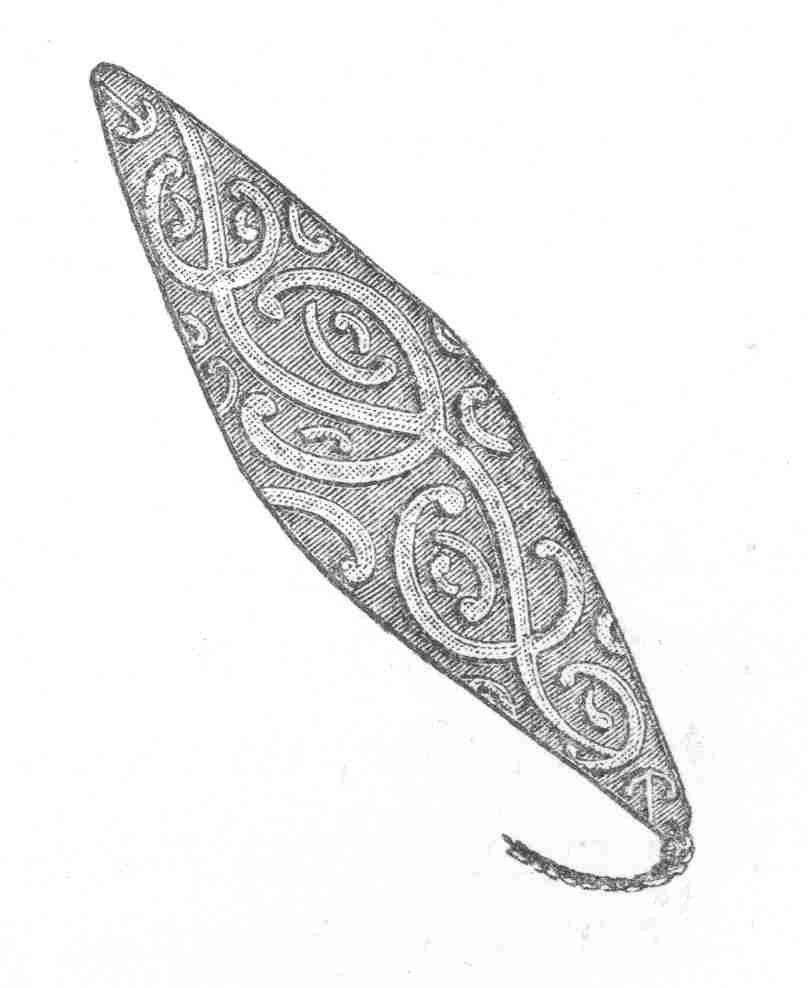 In consequence of all this mummery the Australian women attach great sacredness to the very name of the turndun. They are much less instructed in their own theology than the men of the tribe. One woman believed she had heard Pundjel, the chief supernatural being, descend in a mighty rushing noise, that is, in the sound of the turndun, when boys were being ‘made men,’ or initiated. {35} On turnduns the Australian sorcerers can fly up to heaven. Turnduns carved with imitations of water-flowers are used by medicine-men in rain-making. New Zealand also has her bull-roarers; some of them, carved in relief, are in the Christy Museum, and one is engraved here. I have no direct evidence as to the use of these Maori bull-roarers in the Maori mysteries. Their employment, however, may perhaps be provisionally inferred.
