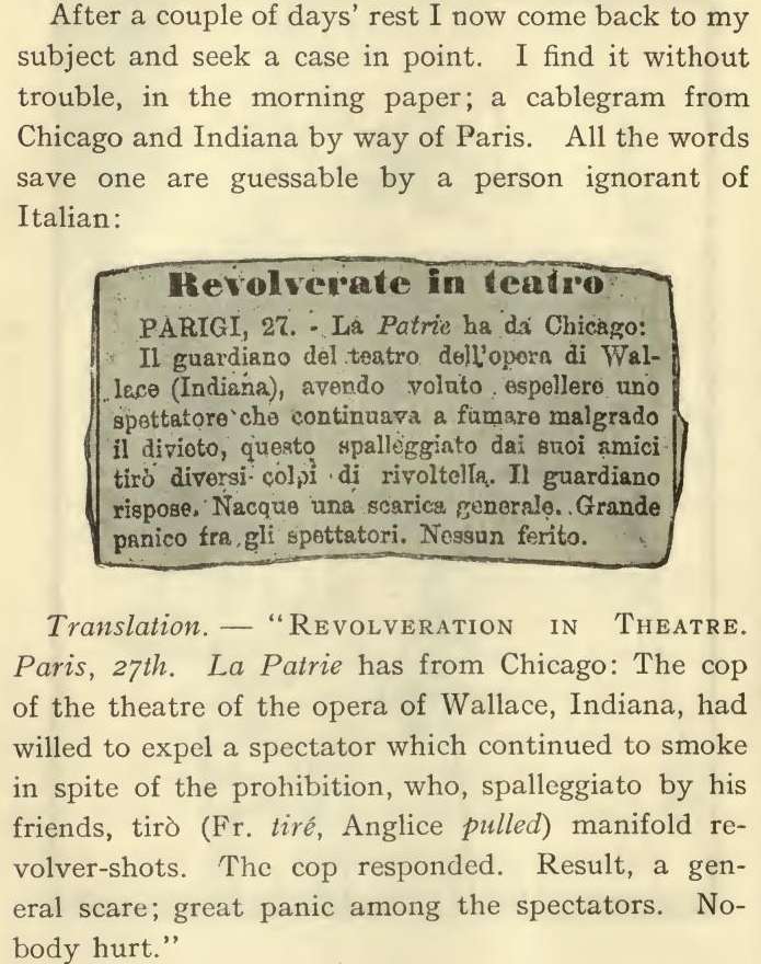 If this reptile is a man, it isn't an it, is it? That wouldn't be grammatical, would it? I think it would be he. I think so. In that case one would parse it thus: nominative, he; dative, him; possessive, his'n. Well, I will consider it a man and call it he until it turns out to be something else. This will be handier than having so many uncertainties.