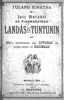 ako'y nag liliban sa makawiwiling liwanag n~g Buan kaguiat nagunitâ ang pinag-usapan dalawang dalagang nagsasalitaan. Pinan~gahasan kong ilagdâ sa papel ang lugód n~g puso, at anong gagauin kung dí makatagal at kusang hapuin ang isip, sa gayong lawig n~g baybain. Bakit sa panahong ito'y nararapat na ang kahit sino'y magtaglay n~g in~gat sa gugol na pagod, at may munting linsád páasahan mo nang may kataling pintas. Kaya sa tulâ kong m~ga itititik ang paunang samo, pantas na lilirip, huag paghanapan n~g malasang tamis ang bubót na bun~ga n~g unsiaming isip. Kung sa pag basa mo'y may mapansing hindí tama ang sabi ko't sa isip mo'y malí, huag hahatulan n~g sirá't ang hin~gi sa pagtutulin mo ay magwari-wari. Sapagka't kung kaya gumugol n~g pagál ang malampang isip kahit gumagapang, adhika n~g puso'y maguing munting tuláy sa tawiring hirap niyaring abang búhay. At kung wala ka mang mapupulon~g lugód sa bun~ga n~g aking pinuhunang pagod, ito'y mabuti ring aliwan n~g lungkot lalo't dinadalaw n~g samá n~g loob. Ihahangang dito't ang boong pasiyá ay nasasa iyo pantas na babasa, sa isasariwâ at ikalalanta ay naroroon din ang aking pag-asa. |