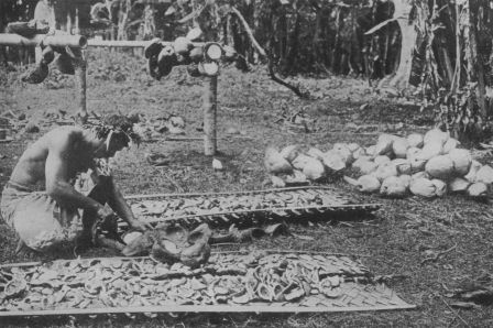 Cutting the meat from cocoanuts to make copra