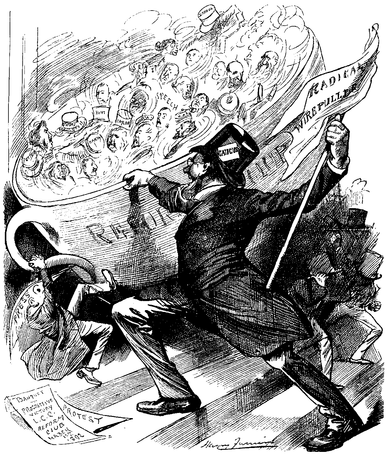 Great day for FLYNN. TIM HEALY thinks he's pretty smart as a debater; SEXTON believes he knows a thing or two; O'BRIEN is understood to be something of an orator. FLYNN will show House how all these qualities may be combined in one man. Does it by the tiresome twenty minutes, the lamentable half-hour; popping up on every question with comically judicial air; talking on with fatal feeble flatulent fluency, whilst GILL sits nursing his hat awaiting his turn.
