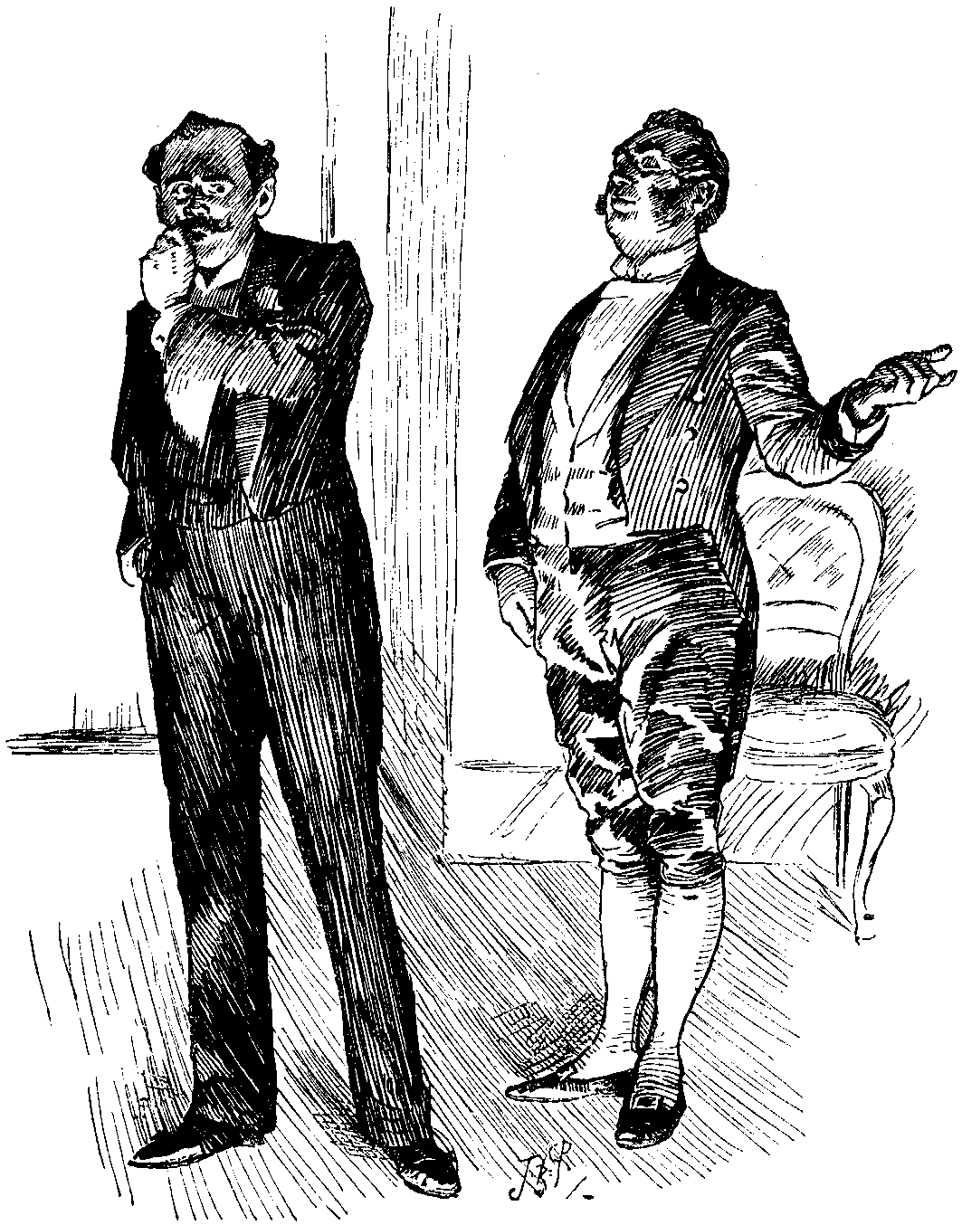 Author. Of course the acting is abominable—but they might make allowances for that. It is so unfair! [The Play proceeds. The Heroine's jealousy has been excited by the Villain, for vague purposes of his own, and the Hero is trying to disarm her suspicions. She. "But why are you constantly going from Paris to London at the beck and call of that man?" He (aside). "If she only knew that I do it to shield my second cousin, JASPER—but my oath!—I cannot tell her! (To her.) The reason is very simple, darling—he is my Private Secretary!" (Roars of inextinguishable laughter, drowning the Wife's expressions of perfect satisfaction and confidence. The Hero wants to go out; the Wife begs him to stay; she has 'a presentiment of evil—a dread of something unseen, unknown.' He goes: the Villain enters in evening dress.) Villain. "Your husband is false to you. Meet me in half an hour at the lonely hut by the cross-roads, and you shall have proof of his guilt." (The Wife departs at once, just as she is. Villain, soliloquising.) "So—my diabolical schemes prosper. I have got JOSEPH out of the way by stratagem, decoyed his wife—my early love—to a lonely hut, where my minions wait to seize her. Now to abduct the child, destroy the certificate of vaccination which alone stands between me and a Peerage, set fire to the home of my ancestors, accuse JOSEPH of all my crimes, and take my seat in the House of Lords as the Earl of Addelegg! Ha-ha—a good night's work! a good—" Joseph (from back). "Not so. I have heard all. I will not have it. You shall not!" (&c., &c.) Villain. "You would thwart my schemes?" Joseph (firmly). "I would. My wife and child shall not—" (&c., &c.) Villain (slowly). "And the oath you swore to my Mother, your dying Aunt, would you break that?" Joseph (overcome). "My oath! my Aunt! Ah, no, I cannot, I must not break it. JASPER [pg 166] SHOPPUN, I am powerless—you must do your evil will!" (He sinks on a settee: Triumph of Villain, tableau, and Curtain.)