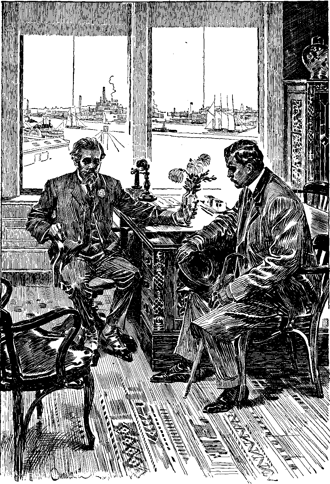 He fell back into the depths of his chair, his fingers drumming on the table beside which he sat. Minutes passed before he spoke again. He got the words out jerkily, huskily, with dry throat.