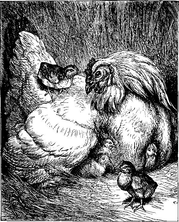 We ran quickly to the place where he was, and there we saw a hen with a brood of chickens. One of the chicks was on its mother's back, one was on the floor in front of her, and the others were peeping out from under her wings. It was a pretty sight.