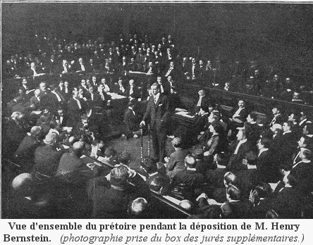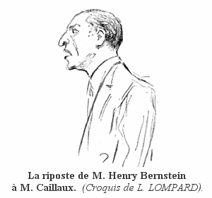 A l'audience suivante, l'un des amis du directeur du Figaro, M. Henry Bernstein, ripostait à M. Caillaux qui l'avait pris à partie, personnellement, en lui reprochant de s'être soustrait aux obligations militaires: «J'ai commis dans ma jeunesse une folie que j'ai regrettée publiquement... J'adore passionnément mon pays. En 1911, au moment de l'affaire d'Agadir, j'ai demandé d'être reversé dans l'armée; j'ai eu l'honneur d'obtenir la cassation de ma réforme. Je suis artilleur, je pars le quatrième jour de la mobilisation, et la mobilisation est peut-être pour demain. Je ne sais pas quel jour part Caillaux, mais je dois le prévenir qu'à la guerre on ne peut pas se faire remplacer par une femme et qu'il faut tirer soi-même.» Et alors ce furent de telles acclamations, un tel déferlement tumultueux que la cour impuissante, désemparée, dut abandonner le terrain, disparaître, se réfugier quelques minutes hors de la salle, fuite précipitée de robes rouges qui se renouvellera le mardi soir, à neuf heures, lorsque le verdict du jury provoquera l'émeute dans le prétoire.