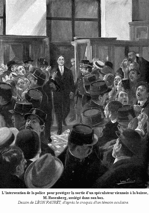 Un incident des plus vifs, bien caractéristique de la nervosité qu'ont provoquée cette semaine les événements extérieurs dans les milieux financiers, s'est produit, lundi, à la Bourse, vers midi et demi. Il y avait alors, comme chaque jour à cette heure, dans les salles des vastes bâtiments, beaucoup d'animation, sinon beaucoup de transactions. Et soudain, le bruit courut dans les groupes que le spéculateur viennois Oscar Rosenberg, auquel les boursiers reprochaient sa campagne de baisse sur la rente, aurait tenu des propos fâcheux sur le marché français. Ce fut l'étincelle qui alluma bien des colères contenues depuis Longtemps. Tout le monde se rua dans la salle des arbitrages, devant le box où s'était réfugié M. Rosenberg, que protégeaient difficilement quelques amis. Une première intervention des agents, accourus en hâte, ne réussit pas à faire cesser le tumulte. Un moment débordés, ils durent revenir à la charge: pendant la bagarre, M. Rosenberg put enfin sortir de son box et gagner, sous la protection de la police, la salle des banquiers. Mais, au dehors, les manifestants guettaient sa sortie. Il fallut organiser un important service d'ordre, dégager complètement le péristyle et les marches du côté de la rue Notre-Dame-des-Victoires, maintenir au loin la foule derrière des barrages d'agents. Alors seulement M. Rosenberg dut quitter la salle des banquiers, et, après avoir descendu le grand escalier désert, monter dans un taxi-auto qu'on avait fait avancer pour lui. |