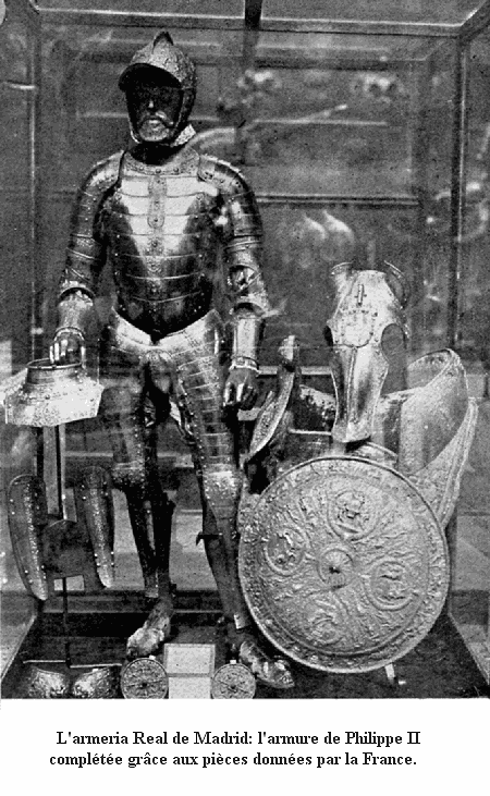 On avait transporté sous les beaux oliviers du jardin de l'hôpital, ancien palais chérifien, les héros de la journée, encore étendus sur leurs lits, ayant endossé pour la circonstance leurs plus coquets uniformes, coloniaux, tirailleurs, et le général dut se pencher vers leurs couches pour agrafer sur ces poitrines les rubans où pendaient la croix ou la médaille. L'ARMURE DE PHILIPPE II L'Armeria Real de Madrid vient de recevoir les pièces manquantes de la fameuse armure de Philippe II qui figuraient au Musée d'Artillerie à Paris. Elles ont été placées dans la vitrine où naguère on n'en voyait qu'une copie à l'aquarelle, le chanfrein au-dessus de la selle, les deux rondelles d'épaule et les deux cubitières aux pieds du mannequin représentant Philippe II, chacune avec une petite étiquette tricolore qui distingue, selon l'écriteau explicatif, «les parties de l'armure offertes par le gouvernement de la République française». Il est probable que le souverain espagnol tiendra à répondre à ce don par un autre analogue à notre Musée d'Artillerie, auquel on sait que la direction de l'Armeria avait pensé à proposer une rondache navarraise et une paire de pistolets français, dont la valeur fut jugée un peu insuffisante alors que la question se présentait sous la forme d'un échange. Mais, depuis, elle a pris le caractère d'une donation gracieuse, si bien que c'est au roi seul qu'appartient l'initiative de la réciprocité. |