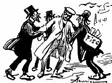 L'impôt sur le capital: —Moi j'ai hypothéqué ma maison. —Moi je n'ai pas de maison, mais j'ai emprunté 60.000 francs. —Tout cela sera déduit de notre capital imposable... Qui fait des dettes s'enrichit. |