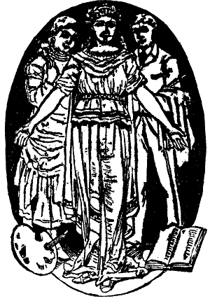 On the left centre wall was a large painting representing Antium, the home of Nero and Temple of Fortuna, with the Appollo Belvidere on a pedestal in the foreground, flanked with two standing vases with burning incense. Above the painting was the motto "Gaudeamus Igitur," resting on a gilt lyre and torch. Medallions representing Spring, Summer, Autumn, and Winter surmounted the draperies on this side of the hall.
