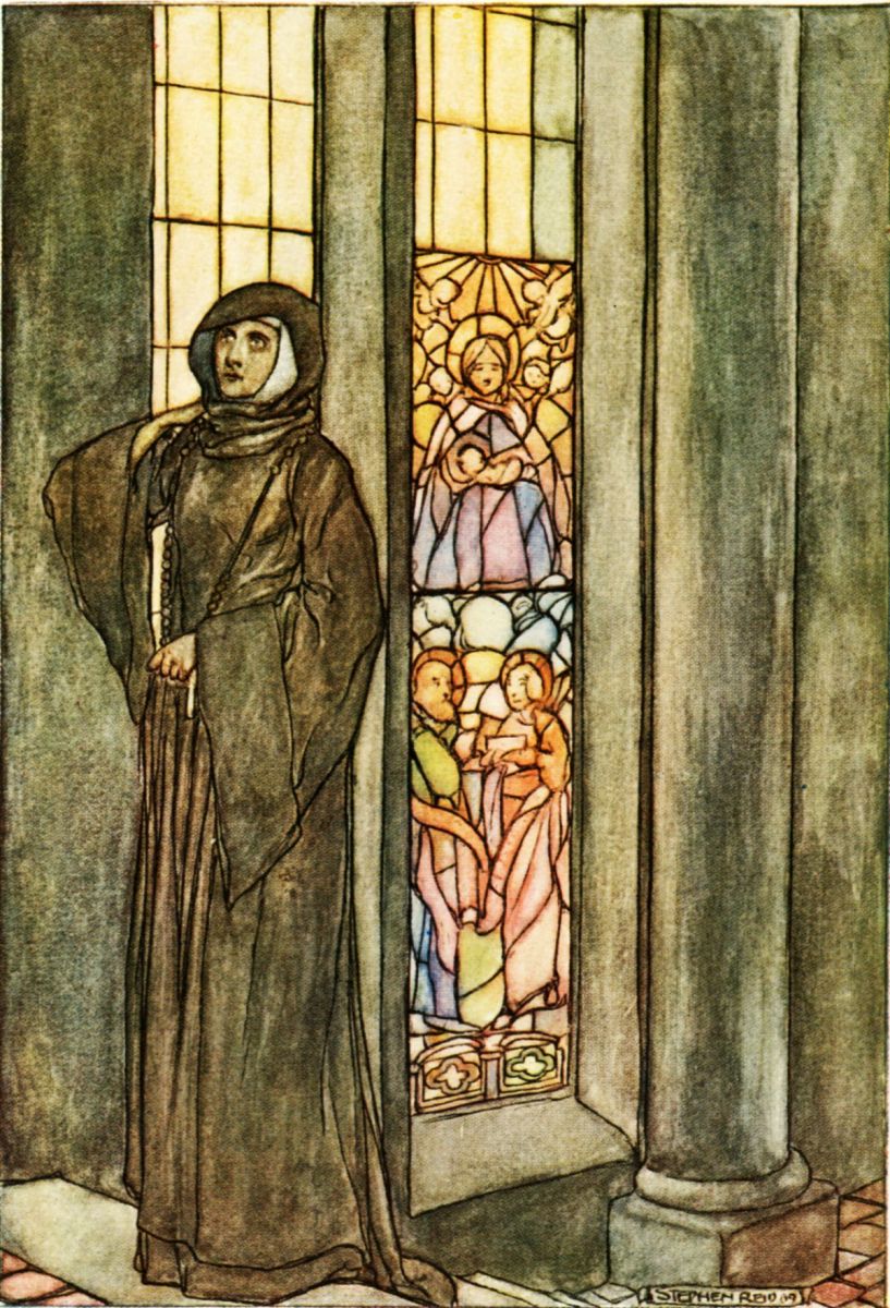 When we come to the Fenian cycle there is a well-defined borderland between them and Christianity. The bulk of the stories is plainly pagan; their originals were frankly so. But the temper of their composers is more civilized than that of those who conceived the tales of the previous cycles; the manners, as I have already said, of their personages are gentler, more chivalrous; and their atmosphere is so much nearer to that of Christianity, that the new Christian elements would find themselves more at home in them than in the terrible vengeance of Lugh, the savage brutality of Conor to Deirdré, or the raging slaughterings of Cuchulain. So much was this the case that a story was skilfully invented which linked in imagination the Fenian cycle to a Christianized Ireland. This story—Oisín in the Land of Youth—is contained in this book. Oisín, or Ossian, the son of Finn, in an enchanted story, lives for 300 years, always young, with his love in Tir-na-n-Óg, and finds on his return, when he becomes a withered old man, St Patrick and Christianity in Ireland. He tells to Patrick many tales of the Fenian wars and loves and glories, and in the course of them paganism and Christianity are contrasted and intermingled. A certain sympathy with the pagan ideas of honour and courage and love enters into the talk of Patrick and the monks, and softens their pious austerity. On the other hand, the Fenian legends are gentled and influenced by the Christian elements, in spite of the scorn with which Oisín treats the rigid condemnation of his companions and of Finn to the Christian hell, and the ascetic and unwarlike life of the monks.[4] There was evidently in the Fenian cycle of story-telling a transition period in which the bards ran Christianity and paganism in and out of one another, and mingled the atmosphere of both, and to that period the last editing of the story of Lir and his Children may be referred. A lovely story in this book, put into fine form by Mr Rolleston, is as it were an image of this transition time—the story or How Ethne quitted Fairyland. It takes us back to the most ancient cycle, for it tells of the great gods Angus and Mananan, and then of how they became, after their conquest by the race who live in the second cycle, the invisible dwellers in a Fairy country of their own during the Fenian period, and, afterwards, when Patrick and the monks had overcome paganism. Thus it mingles together elements from all the periods. The mention of the great caldron and the swine which always renew their food is purely mythological. The cows which come from the Holy Land are Christian. Ethne herself is born in the house of a pagan god who has become a Fairy King, but loses her fairy nature and becomes human; and the reason given for this is an interesting piece of psychology which would never have occurred to a pagan world. She herself is a transition maiden, and, suddenly finding herself outside the fairy world and lost, happens on a monastery and dies on the breast of St Patrick. But she dies because of the wild wailing for her loss of the fairy-host, whom she can hear but cannot see, calling to her out of the darkened sky to come back to her home. And in her sorrow and the battle in her between the love of Christ and of Faerie, she dies. That is a symbol, not intended as such by its conceiver, but all the more significant, of the transition time. Short as it is, few tales, perhaps, are more deeply charged with spiritual meaning.