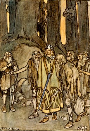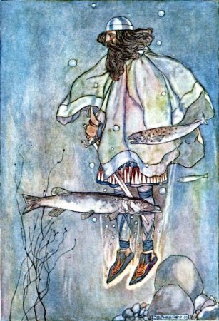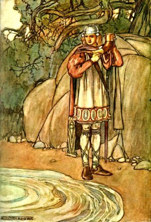 These great and small aspects of Nature are not only celebrated, they are loved. One cannot read the stories in this book without feeling that the people who conceived and made them observed Nature and her ways with a careful affection, which seems to be more developed in the Celtic folk than elsewhere in modern Europe. There is nothing which resembles it in Teutonic story-telling. In the story of The Children of Lir, though there is no set description of scenery, we feel the spirit of the landscape by the lake where Lir listened for three hundred years to the sweet songs of his children. And, as we read of their future fate, we are filled with the solitude and mystery, the ruthlessness and beauty of the ocean. Even its gentleness on quiet days enters from the tale into our imagination. Then, too, the mountain-glory and the mountain-gloom are again and again imaginatively described and loved. The windings and recesses, the darkness and brightness of the woods and the glades therein, enchant the Fenians even when they are in mortal danger. And the waters of the great lakes, the deep pools of the rivers, the rippling shallows, the green banks, the brown rushing of the torrents, are all alive in the prose and song of Ireland. How deep was the Irish love of these delightful things is plain from their belief that "the place of the revealing of poetry was always by the margin of water." And the Salmon of Knowledge, the eating of which gave Finn his pre-eminence, swam in a green pool, still and deep, over which hung a rowan tree that shed its red berries on the stream. Lovely were the places whence Art and Knowledge came.