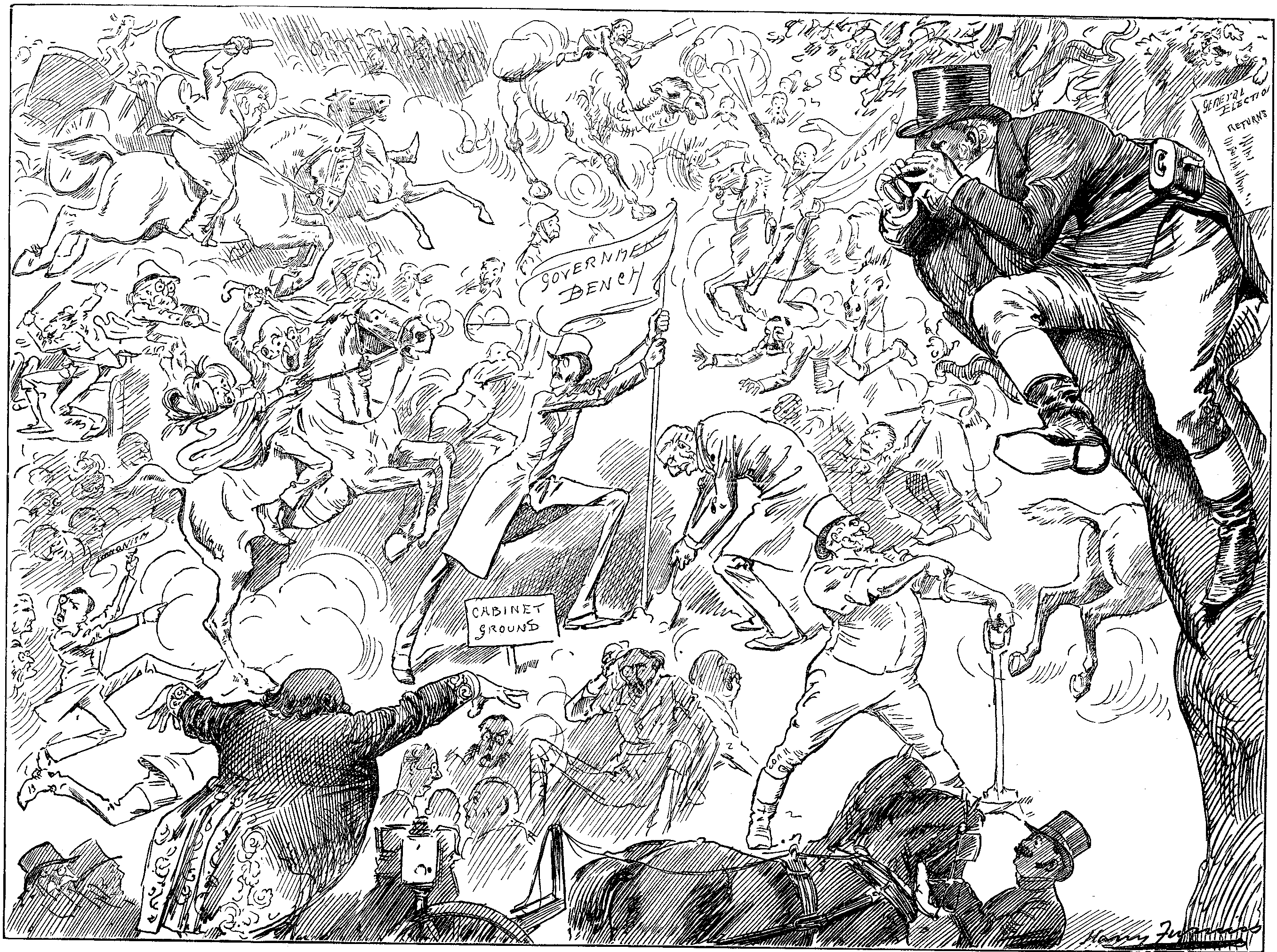 The Prof. (instructively). It is natural For a Horse when frightened at anything in Front of him, To jump Backwards, and when frightened at anything Back of him, To jump Forwards. (Applause, in recognition of the accuracy and observation of this axiom.) Now I will show you my method Of correcting this Tendency by means Of my double Safety Rope and driving Rein, without Cruelty. Always Be Humane, Never causing any Pain if you Possibly can Help it. Fetch that Harness. (The short Groom trips again, but so elaborately as to be immediately recognised as the funny man of the performance, after which his awkwardness ceases to entertain. The Professor shouts, "Woa!" and, as the horse declines to accept this suggestion, emphasises it by pulling the double rope, which, being attached to the animals forelegs, promptly brings him on his knees, much to his surprise and indignation.) Never use the word "Woa!" Only when you mean your horse To stop. Woa! (horse down again, intensely humiliated.) If you mean him just To go quiet, say "Steady!" and teach him The difference Of the words. Never afterwards Deceiving him. (Paterf. makes a note of this on Tartar's account.) Steady ... Woa! (Same business repeated; horse evidently feeling that he is the victim of a practical joke, and depressed. Finally, Professor says "Woa!" without pulling, and horse thinks it better to take the hint.)
