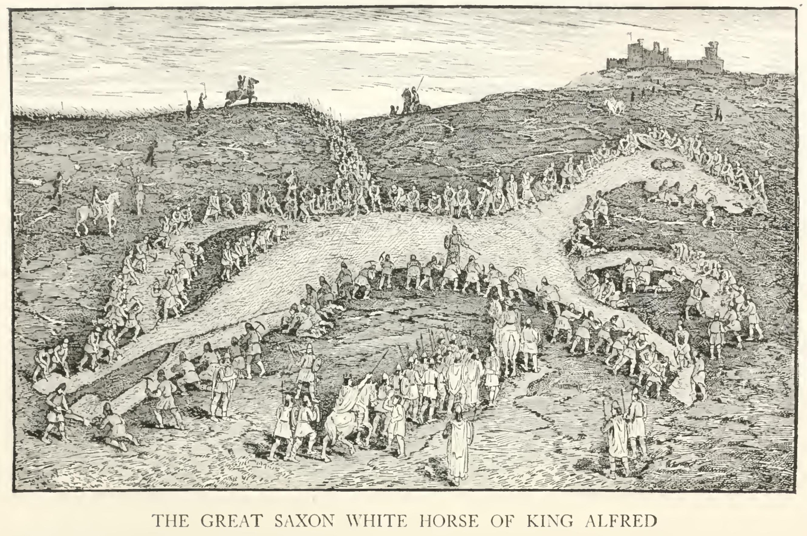 And now we leave the camp, and descend towards the west, and are on the Ashdown. We are treading on heroes. It is sacred ground for Englishmen—more sacred than all but one or two fields where their bones lie whitening. For this is the actual place where our Alfred won his great battle, the battle of Ashdown (“Aescendum” in the chroniclers), which broke the Danish power, and made England a Christian land. The Danes held the camp and the slope where we are standing—the whole crown of the hill, in fact. “The heathen had beforehand seized the higher ground,” as old Asser says, having wasted everything behind them from London, and being just ready to burst down on the fair Vale, Alfred's own birthplace and heritage. And up the heights came the Saxons, as they did at the Alma. “The Christians led up their line from the lower ground. There stood also on that same spot a single thorn-tree, marvellous stumpy (which we ourselves with our very own eyes have seen).” Bless the old chronicler! Does he think nobody ever saw the “single thorn-tree” but himself? Why, there it stands to this very day, just on the edge of the slope, and I saw it not three weeks since—an old single thorn-tree, “marvellous stumpy.” At least, if it isn't the same tree it ought to have been, for it's just in the place where the battle must have been won or lost—“around which, as I was saying, the two lines of foemen came together in battle with a huge shout. And in this place one of the two kings of the heathen and five of his earls fell down and died, and many thousands of the heathen side in the same place.” * After which crowning mercy, the pious king, that there might never be wanting a sign and a memorial to the country-side, carved out on the northern side of the chalk hill, under the camp, where it is almost precipitous, the great Saxon White Horse, which he who will may see from the railway, and which gives its name to the Vale, over which it has looked these thousand years and more.