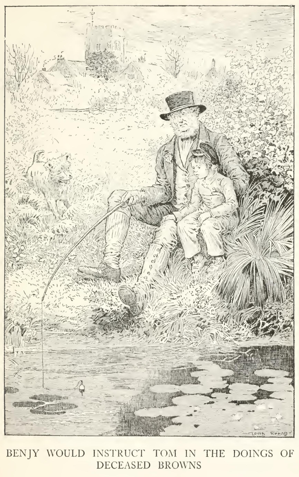 But old Benjy was young master's real delight and refuge. He was a youth by the side of Noah, scarce seventy years old—a cheery, humorous, kind-hearted old man, full of sixty years of Vale gossip, and of all sorts of helpful ways for young and old, but above all for children. It was he who bent the first pin with which Tom extracted his first stickleback out of “Pebbly Brook,” the little stream which ran through the village. The first stickleback was a splendid fellow, with fabulous red and blue gills. Tom kept him in a small basin till the day of his death, and became a fisherman from that day. Within a month from the taking of the first stickleback, Benjy had carried off our hero to the canal, in defiance of Charity; and between them, after a whole afternoon's popjoying, they had caught three or four small, coarse fish and a perch, averaging perhaps two and a half ounces each, which Tom bore home in rapture to his mother as a precious gift, and which she received like a true mother with equal rapture, instructing the cook nevertheless, in a private interview, not to prepare the same for the Squire's dinner. Charity had appealed against old Benjy in the meantime, representing the dangers of the canal banks; but Mrs. Brown, seeing the boy's inaptitude for female guidance, had decided in Benjy's favour, and from thenceforth the old man was Tom's dry nurse. And as they sat by the canal watching their little green-and-white float, Benjy would instruct him in the doings of deceased Browns. How his grandfather, in the early days of the great war, when there was much distress and crime in the Vale, and the magistrates had been threatened by the mob, had ridden in with a big stick in his hand, and held the petty sessions by himself. How his great-uncle, the rector, had encountered and laid the last ghost, who had frightened the old women, male and female, of the parish out of their senses, and who turned out to be the blacksmith's apprentice disguised in drink and a white sheet. It was Benjy, too, who saddled Tom's first pony, and instructed him in the mysteries of horsemanship, teaching him to throw his weight back and keep his hand low, and who stood chuckling outside the door of the girls' school when Tom rode his little Shetland into the cottage and round the table, where the old dame and her pupils were seated at their work.