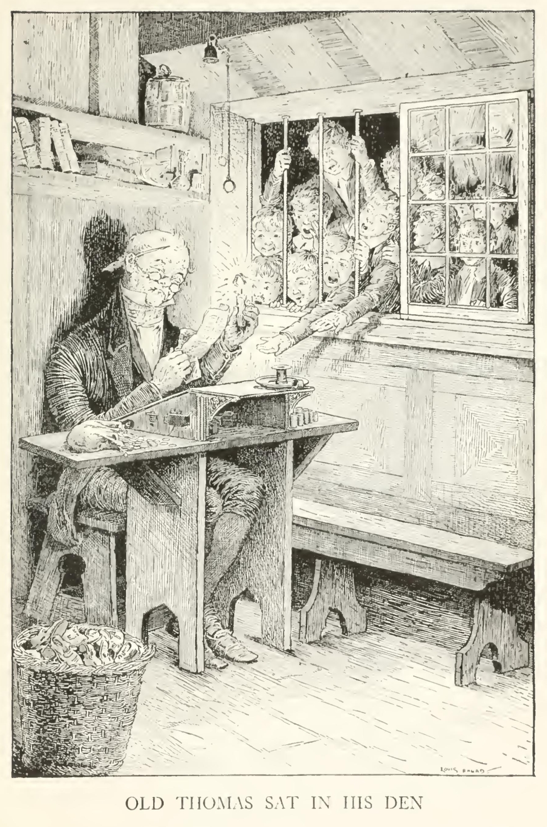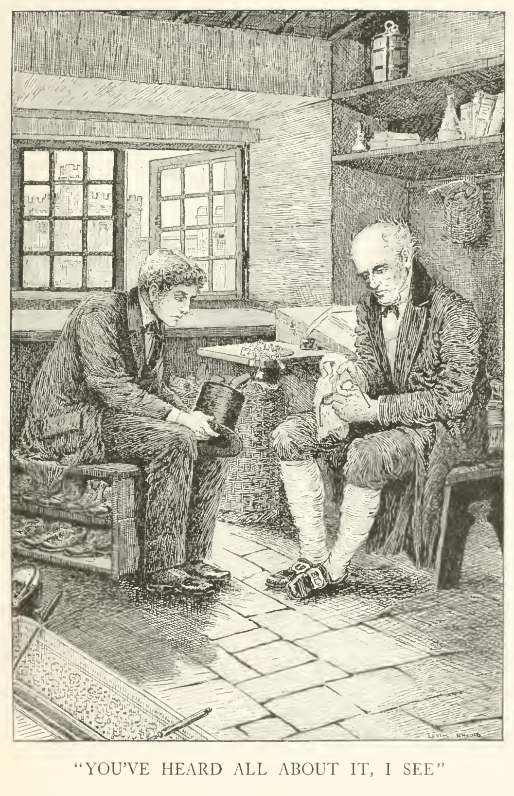 “Ah! you've heard all about it, sir, I see,” said he. Tom nodded, and then sat down on the shoe-board, while the old man told his tale, and wiped his spectacles, and fairly flowed over with quaint, homely, honest sorrow.