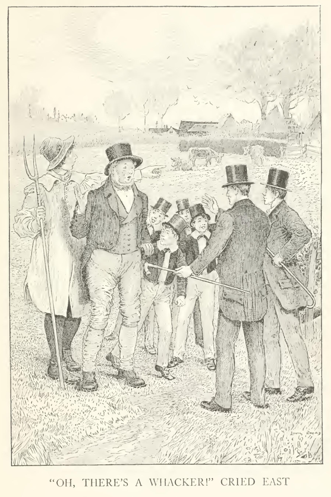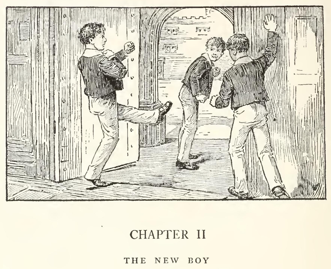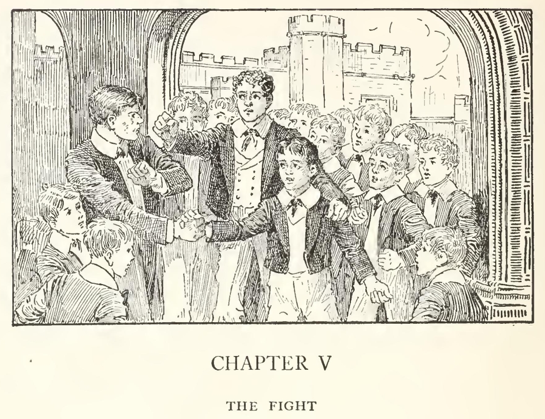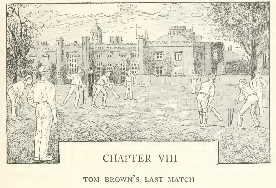 He walked quickly through the quadrangle and out into the close. The longing which had been upon him and driven him thus far, like the gad-fly in the Greek legends, giving him no rest in mind or body, seemed all of a sudden not to be satisfied, but to shrivel up and pall. “Why should I go on? It's no use,” he thought, and threw himself at full length on the turf, and looked vaguely and listlessly at all the well-known objects. There were a few of the town boys playing cricket, their wicket pitched on the best piece in the middle of the big-side ground—a sin about equal to sacrilege in the eyes of a captain of the eleven. He was very nearly getting up to go and send them off. “Pshaw! they won't remember me. They've more right there than I,” he muttered. And the thought that his sceptre had departed, and his mark was wearing out, came home to him for the first time, and bitterly enough. He was lying on the very spot where the fights came off—where he himself had fought six years ago his first and last battle. He conjured up the scene till he could almost hear the shouts of the ring, and East's whisper in his ear; and looking across the close to the Doctor's private door, half expected to see it open, and the tall figure in cap and gown come striding under the elm-trees towards him.