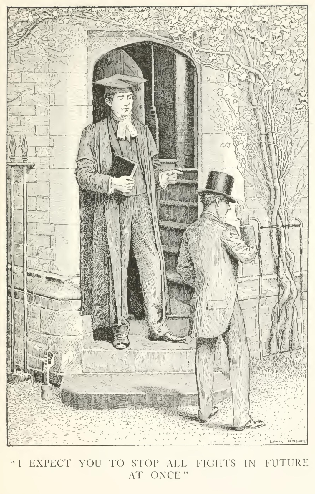 As Tom and the rest of the eleven were turning back into the close, and everybody was beginning to cry out for another country-dance, encouraged by the success of the night before, the young master, who was just leaving the close, stopped him, and asked him to come up to tea at half-past eight, adding, “I won't keep you more than half an hour, and ask Arthur to come up too.”