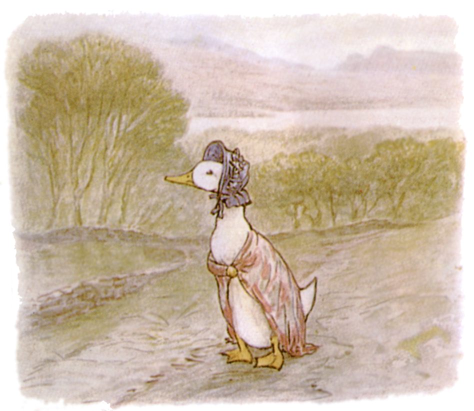 Jemima Puddle-duck was rather surprised to find such a vast quantity of feathers. But it was very comfortable; and she made a nest without any trouble at all.
