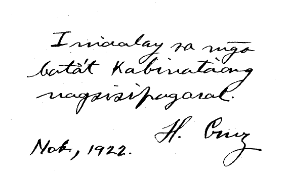 N~guni't hindi dapat pagtakhan ang pagkamanghang yaón n~g m~ga bata, sapagka't sa ating m~ga paaralang-bayan, ang kabuhayan ni Andrés Bonifacio at ang kasaysayan n~g "Katipunan" ay itinuturo n~g pahalaw lamang sa m~ga nagsisipagaral na n~g "septimo grado," na hindi ipinakikilala ang buong kasaysayan n~g "Katipunan" at gayon din ang kanyang makabayang palatuntunan at matataas na aral na ipinunla sa bayan, na siyang nagturo't nagakay sa m~ga pilipino sa pagguhó n~g kalupitan at pangbubusabos at nagtanim sa ating m~ga puso n~g manin~gas na damdamin n~g Kalayaan at Kasarinlan.