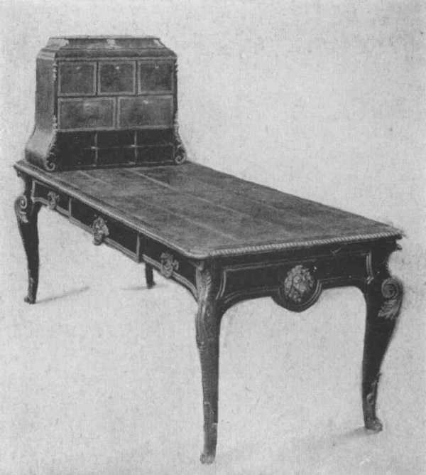 The period of Louis XIV in France was another "magnificent" period and should not be used in small or simple houses. Louis XIV furniture was large and massive, lavish in gilding and carving and ornament, but had dignity as well as splendor. The Gobelin and Beauvais Tapestry Works produced their wonderful series of tapestries, and Boulle inlay of brass and tortoise shell was lavished on furniture, and the ormolu mounts were beautiful and elaborate. All workmanship was of the highest. During the early part of the period the legs of chairs and tables were straight and square in shape, sometimes tapering, and much carved, and had underframing. Later they were curved and carved, a kind of elaborate cabriole leg, and had carved underframing. Toward the end of the period the curved leg and underframing became much simpler, some of the furniture having no underframing, and slowly the style merged into that of the Regency and Louis XV. The illustrations for the long chapter on Louis XIV show some very fine examples of both the grand and simple form of chair, and also show that comfort was becoming more of a fact. The materials used for upholstery were brocades of large pattern, tapestries, and splendid velvets. Tables, chests, armoires, desks, console tables, mirrors, screens, all were carved or painted or inlaid, gilded and mounted with wonderful metal mounts.