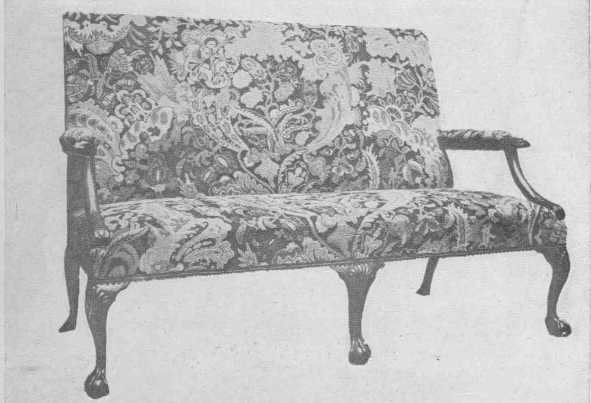 The cup-and-ball design of turned legs with curved stretchers was used for chairs, settees, tables, cabinets. China cupboards with their double-hooded tops and soft colored brocade linings were used to display the wonderful china collections so much in vogue. There was much upholstered furniture covered with beautiful petit-point, which is perfectly reproduced nowadays, but is naturally expensive. Silks, velvets, and damasks were also used, and Queen Mary had a "beautiful chintz bed."