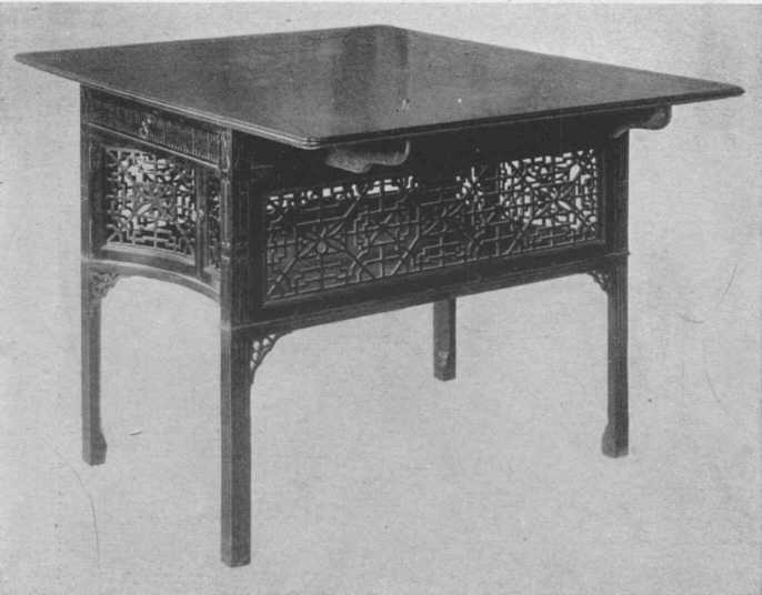 These copies of rare old pieces of furniture are of the best. The choice of wood, the carving, the inlay, all show the highest ideals. The Chinese Chippendale table shows the pagoda effect, and the Hepplewhite desk has the charm of a secret drawer.