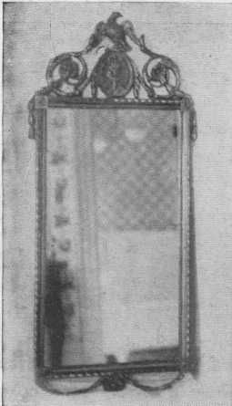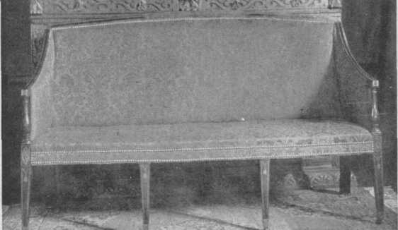 The change from Louis XVI to the Empire was a violent one both politically and artistically. The influence of the great days of the Roman empire and the mystery of ancient Egypt stirred Napoleon's imagination and formed his taste. Empire furniture was solid and heavy, with little or no carving, and much ornamentation of metal mounts. Mahogany was chiefly used, and some furniture was gilded or bronzed. Round columns finished with metal capitals and bases appeared on large desks and other pieces of furniture. Chairs were solid, many of them throne-like in design, and many with elaborately carved arms in the form of swans and sphinxes, and metal ornaments. The simpler form of chair, which was copied and used extensively in America, as a dining-chair, often had a curved back and graceful lines. Furniture coverings were very bright satins and velvets brocaded with the Emperor's favorite emblems, the bee, torch, wreath, anthemion. It is a heavy and gaudy style and must be used with great discretion. American Empire furniture was far simpler and is better suited to many American homes. In buying it, however, one must be careful to select copies from the earlier part of the time, for it fast deteriorated into heavy and vulgar curves. This American Empire furniture is often shown in the shops under the name of Colonial, which is a misnomer, as we had ceased to be colonies years before it came into existence. It was used during the first half of the nineteenth century.