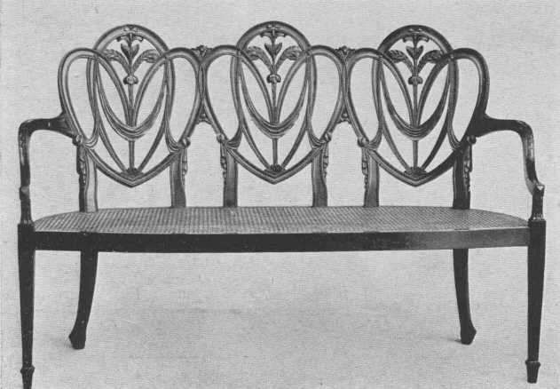 Hepplewhite's furniture has much of the delicacy of Adam's work, by whom, without doubt, he was influenced, as he was also by the French styles of the time. Luckily his own personality and sense of beauty and ingenuity were strong enough to develop a marked and beautiful style of his own. His favorite chair back was shield-shaped (see page 83), and he also used heart-shaped and wheel backs, either round or oval, and charmingly painted little panels. The three feathers of the Prince of Wales was a favorite design. He also made ladder-back chairs, usually with four rails. On much of his furniture the legs tapered on the inside edge only and were put in at a slight angle which gave security both in fact and appearance. He also used reeded legs. His console and other tables are beautiful in design and workmanship, being painted usually in different forms of the radiating fan design, or inlaid with beautiful colored woods. The inlay used was often oval in shape, sometimes only a line and sometimes panels of different woods or matched veneer. The handles used were round or oval. He made sofas and settees with either chair-back backs or all upholstered with the frame showing and the covering tacked on with brass tacks close together. His cabinets are fascinating, with their beautiful inlay and delicate strap work over the glass. He made four-post beds with fluted posts, and chests of drawers and little work tables and candle-stands and screens; and one thing we must be deeply grateful to him for is that he developed the sideboard into a really useful and beautiful piece of furniture. He made nearly everything in the way of necessities, and all show the marks of his taste. His dining-tables were on the plan of those of Chippendale but lighter in effect with tapering legs instead of the long cabriole leg ending in claw feet. His mirrors were usually oval with charming festoons. His favorite woods were mahogany and satin-wood, and he used many fine woods for inlay. Chintz and taffeta and fine velvet are all appropriate to use.