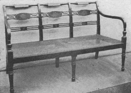 A three-chair settee of the Sheraton period, lacquered, and with cane seat. It would be appropriate for a living-room or hall.