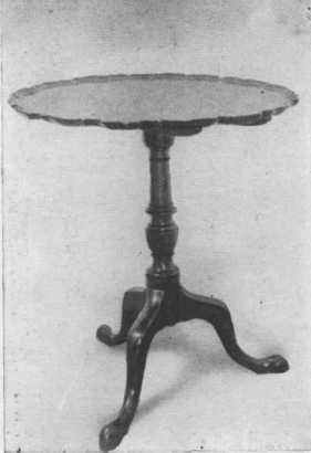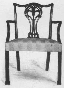 When Chippendale began his fine work, the Dutch influence of Queen Anne's reign was still strong, and this shows in his furniture; but his genius lightened and improved it. The characteristics of his style which remained fairly stable through his different phases were the use of mahogany, a certain squareness and solidity of design which has no appearance of heaviness because of the fine proportions, chair backs with a center splat reaching to the seat. The curving top rail always had curving up corners (see drawings page 84). The center splat was solid at first, but soon was pierced and carved, and went through the many developments of his style such as ribbon-back, Chinese, and Gothic. In some chairs he also used horizontal rails, and what are called "all-over backs." The legs of his earlier furniture were cabriole, and later they were straight. He used much and beautiful carving, gave great attention to the beauty of the wood and the perfection of workmanship and finish. Chippendale's settees were at first designed like two chair backs side by side, and if a larger settee was made either a third chair back of the same design or a different but harmonizing one was used. His dining-tables were made up of two center pieces with wide flaps on each side, and two semicircular tables, and all four pieces could be fastened together into one long table by brass fasteners. The end pieces were used as side tables or sideboards, for the sideboard as we know it did not come until later. He also made oblong sidetables, some with marble tops, which were used as sideboards with wine-coolers placed underneath, and usually a large tea-caddy or tea box on top. The beds which Chippendale made were large and elaborate four-posters, with beautiful carved cornices and posts. The curtains hung from the inside of the cornice, and silks or chintz were used for the curtains. His mirror frames were very elaborately carved, and in his rococo period were fairly fantastic with dripping water, Chinese pagodas, rocks, birds with long beaks, and figures. They were gilded, and some were left in the natural mahogany. He made folding card-tables with saucer-like places at the corners for candles, and later when the candle-stand came into fashion, the tables were made without them.
