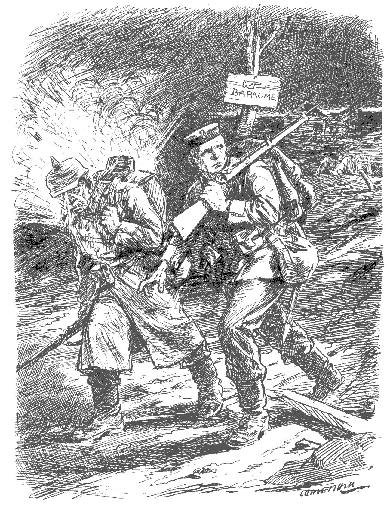 MY DEAR CHARLES,—Recent events calling for strong comment, I turned to my friend, my brick-red friend who is able to retain his well-fed prosperous look notwithstanding the rigours of trench life, Rrobert James McGrregor. I took a map with me and, calling his attention to the general position, asked him what about it? McGregor, as you may guess, is a Scot, whose national sense of economy seems to have spread to his uniform, in that the cap he wears covers but a third-part of his head, and his tunic (which I ought really not to call a tunic but a service jacket) appears to have exhausted itself and its material at the fourth button. Notwithstanding all this, I attach great weight to his truculent views, and, the better to incite him into something outright, addressed him in My best Scottish, which is, at any rate, as good as his best English. "Rrrrrobert," I said, "what like is the VON HINDENBURG line?" Whereupon McGregor, helping himself to our mess whisky and cursing it as the vilest production of this vile War, spoke out.