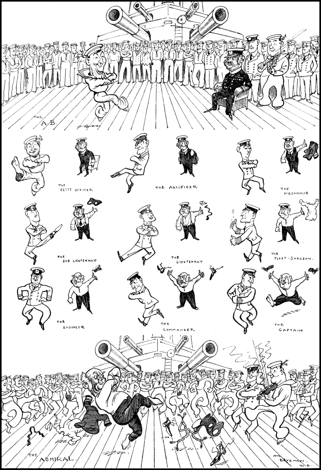 Torpedoed mine-sweeper (to his pal). "AS I WAS A-SAYIN', BOB, WHEN WE WAS INTERRUPTED, IT'S MY BELIEF AS 'OW THE SUBMARINE BLOKES AIN'T ON 'ARF AS RISKY A JOB AS THE BOYS IN THE AIRY-O-PLANES."