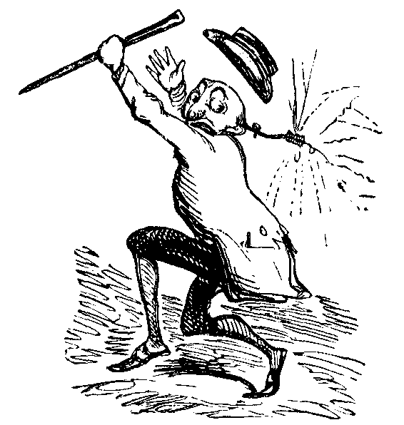 A grand gladiatorial tongue-threshing took place lately in a field near Paisley, between the two great Chartist champions—Feargus O’Connor and the Rev. Mr. Brewster. The subject debated was, Whether is moral or physical force the fitter instrument for obtaining the Charter? The Doctor espoused the moral hocussing system, and Feargus took up the bludgeon for physical force. After a pretty considerable deal of fireworks had been let off on both sides, it was agreed to divide the field, when Feargus, waving his hat, ascended into a tree, and called upon his friends to follow him. But, alas! few answered to the summons,—he was left in a miserable minority; and the Doctor, as the Yankees say, decidedly “put the critter up a tree.” Feargus, being a Radical, should have kept to the root instead of venturing into the higher branches of political economy. At all events the Doctor, as the Yankees say, “put the critter up a tree,” where we calculate he must have looked tarnation ugly. The position was peculiarly ill-chosen—for when a fire-and-faggot orator begins to speak trees-on, it is only natural that his hearers should all take their leaves!