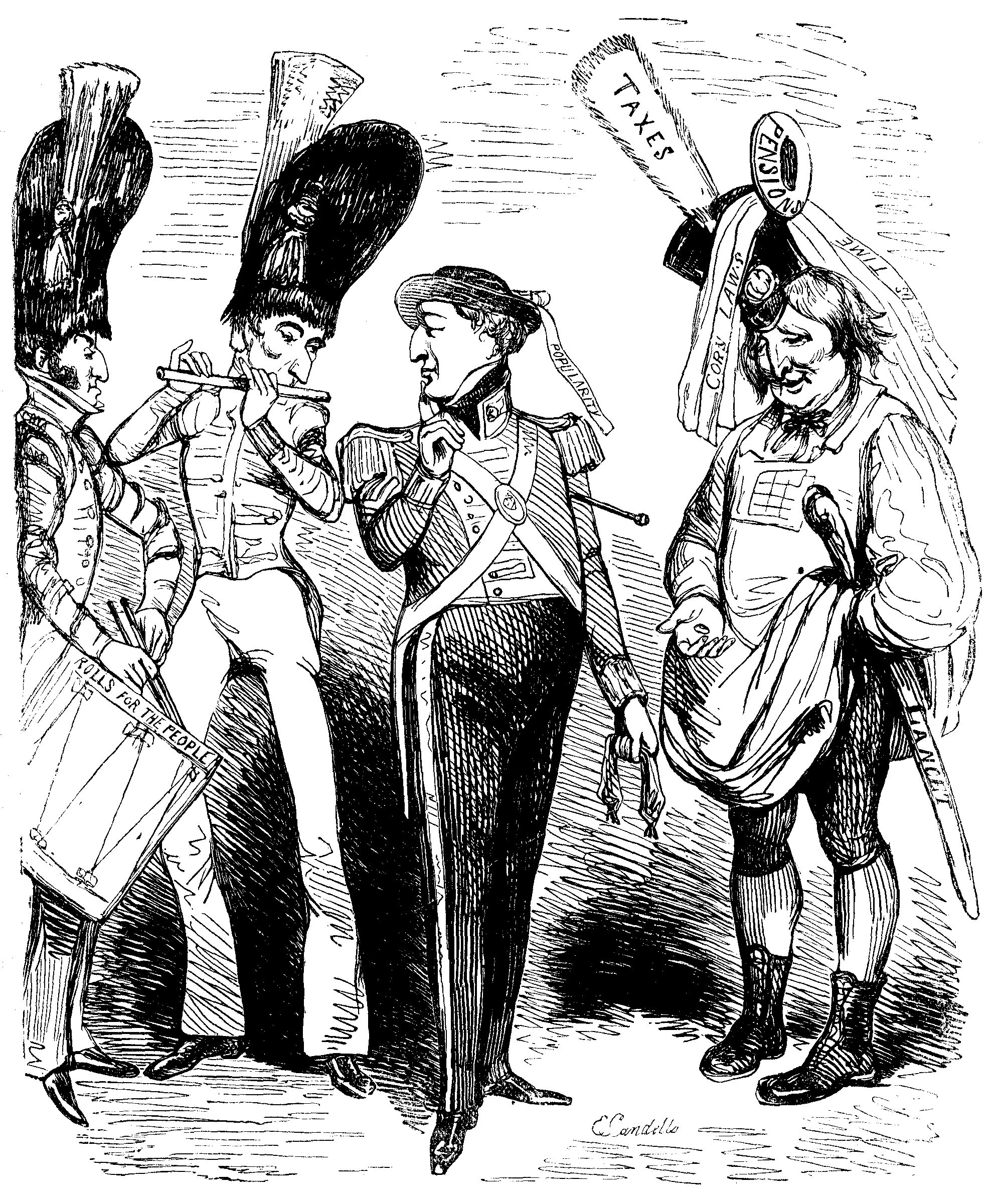 A great party mustered on Friday last, in the New Cut, to hear Mr. Briggles chant a new song, written on the occasion of the birth of the young Prince. He was accompanied by his friend Mr. Handel Purcell Mozart Muggins on the drum and mouth-organ, who afterwards went round with his hat.