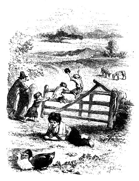The common on which Giles' hovel stands is quite a deep marsh in a wet winter, but in summer it looks green and pretty enough. To be sure, it would be rather convenient, when one passes that way in a carriage, if one of the children would run out and open the gate; but instead of any one of them running out as soon as they hear the wheels, which would be quite time enough, what does Giles do but set all his ragged brats, with dirty faces, matted locks, and naked feet and legs, to lie all day upon a sand-bank hard by the gate, waiting for the slender chance of what may be picked up from travellers. At the sound of a carriage, a whole covey of these little scarecrows start up, rush to the gate, and all at once thrust out their hats and aprons; and for fear this, together with the noise of their clamorous begging, should not sufficiently frighten the horses, they are very apt to let the gate slap full against you, before you are half way through, in their eager scuffle to snatch from each other the halfpence which you may have thrown out to them. I know two ladies who were one day very near being killed by these abominable tricks.