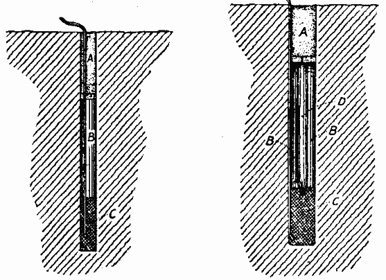 It is obvious that enough powder must be inserted in the hole to produce a force sufficient to move the entire mass of rock on its bed. In some kinds of stone, notably sandstone, the material is so soft that it will break when acted upon by the force necessary to shear the block. In cases of this kind a number of holes should be drilled and fired simultaneously by the electric battery. In such work it is usual to put in the holes only 4 or 5 ft. apart. The powder must, of course, be provided with a fuse or preferably a fulminating cap. It is well to insert the cap at or near the bottom of the cartridge, as shown in Figs. 8 and 9.