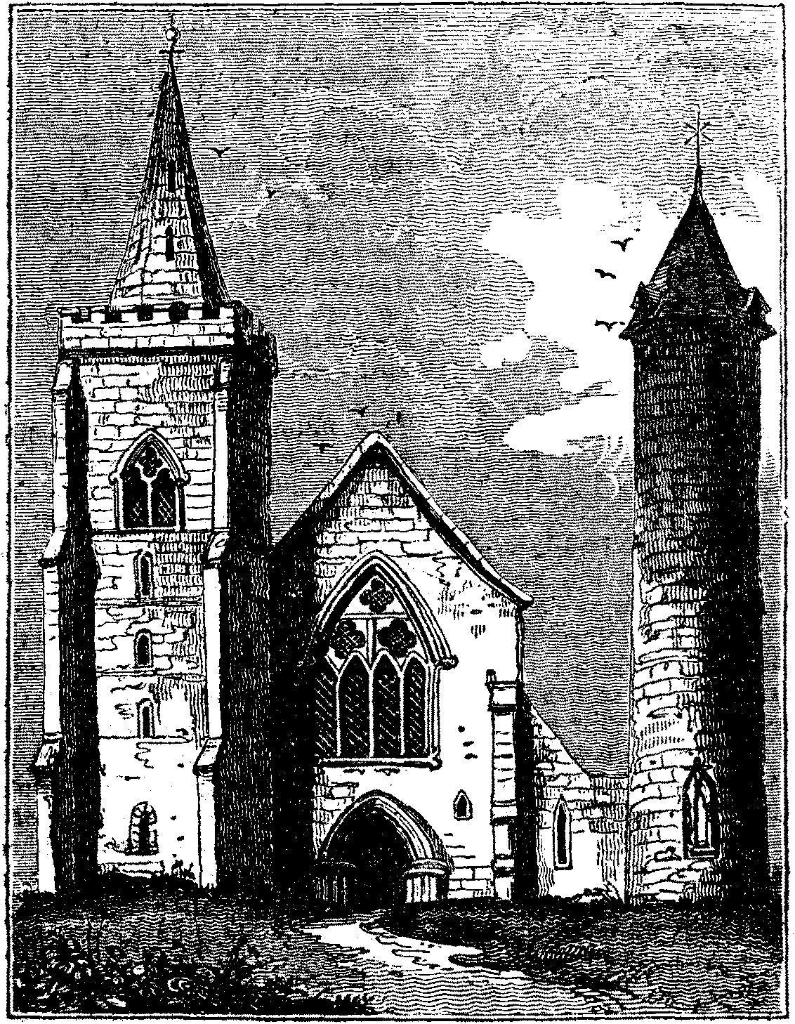 There have been numerous discussions respecting the purposes for which these towers were built; they are generally adjoining to churches, whence they seem to be of a religious nature. Mr. Vallencey considers it as a settled point, that they were an appendage to the Druidical religion, and were, in fact, towers for the preservation of the sacred fire1 of the [pg 194] Druids or Magi. To this Mr. Gough, in his description of Brechin Tower,2 raises an insuperable objection. But they are certainly not belfries; and as no more probable conjecture has been made on their original purpose, they are still known as Fire Towers.