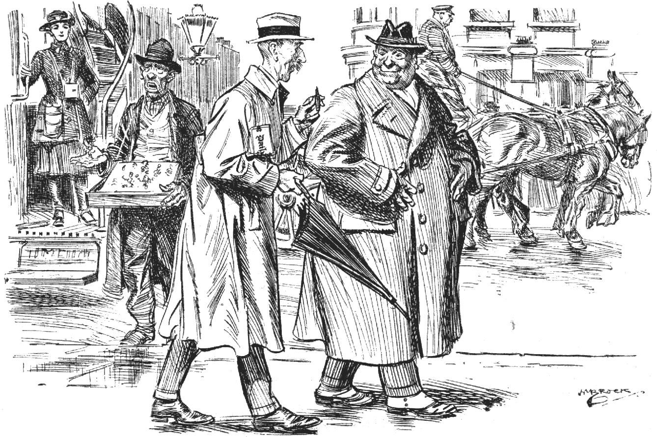 St. Ives was looking at me while she knitted. I raised my hat to her and smiled. We had been such good friends all the evening—how could I ever forget it? But she did not smile; she only stared. She seemed to think I was mad. Macclesfield was reading his Star just as if he had never hurled himself on to the top of the 'bus. The flapper [pg 295] was squinting at herself in a little pocket-mirror; she looked contemptuously at me as I passed. Old York was half asleep. One would think they had never been rushing about in that frantic General Post. And we were all inside the car again.