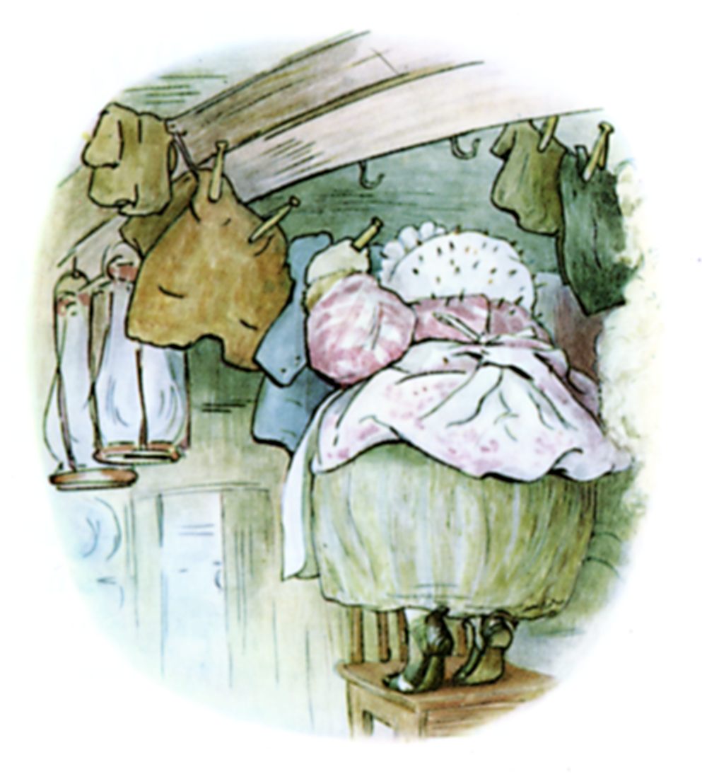 And she hung up all sorts and sizes of clothes—small brown coats of mice; and one velvety black moleskin waist-coat; and a red tailcoat with no tail belonging to Squirrel Nutkin; and a very much shrunk blue jacket belonging to Peter Rabbit; and a petticoat, not marked, that had gone lost in the washing—and at last the basket was empty!