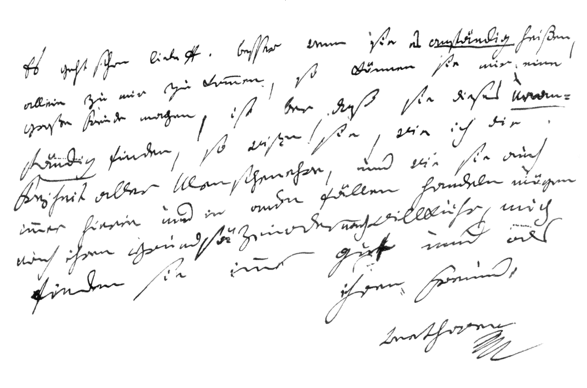 Hofrath von Breuning and I have carefully considered what is best to be done. We think for the time being no other course is practicable than that Karl should remain with me a few days (during the interval until he can enter the military service). His language is still excitable under the impression that I would reprimand him since he was capable of making an attempt on his life. He has, however, shown himself quite affectionate toward me. Be assured that to me fallen humanity is still holy. A warning from you would probably have good results. It would do no harm to let him know that unobserved he will be watched while with me. Accept my highest esteem for yourself, and consider me as one who loves his kind, who desires only good wherever possible.