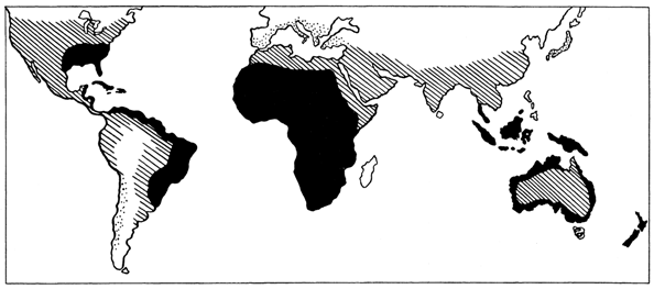 More than any other land, Africa lies in the tropics, with a warm, dry climate, save in the central Congo region, where rain at all seasons brings tropical luxuriance. The flora is rich but not wide in variety, including the gum acacia, ebony, several dye woods, the kola nut, and probably tobacco and millet. To these many plants have been added in historic times. The fauna is rich in mammals, and here, too, many from other continents have been widely introduced and used.