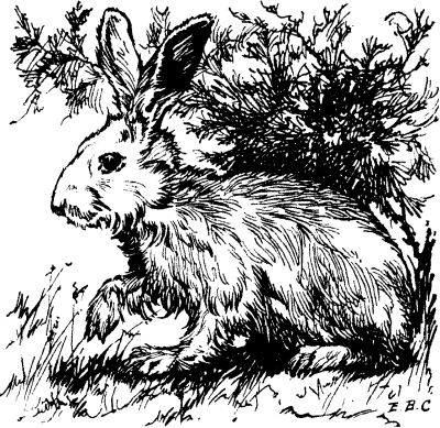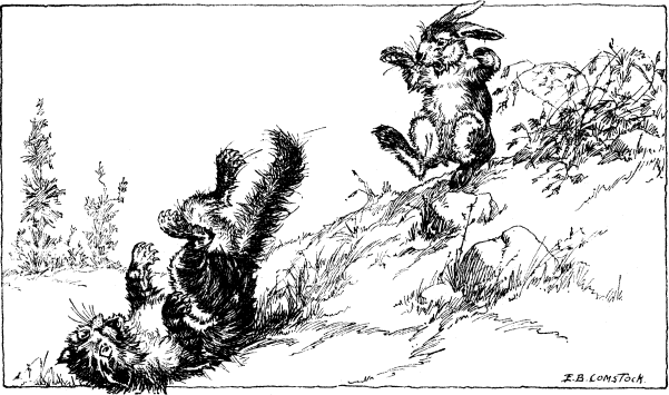 The boy jumped up and ran down the path into the garden. There he met Old Klaws the House Cat, with a little brown baby rabbit in his mouth. "You wicked old cat," said little Luke, "drop it, drop it, I say." But Old Klaws only growled and gripped the little rabbit tighter. Little Luke seized the old cat by the back of the neck and choked him till he let go. The little brown rabbit looked up at him with his big round eyes, as much as to say, "Thank you, little boy, thank you." Then he hopped off into the thicket of berry bushes, where Old Klaws could not catch him again.