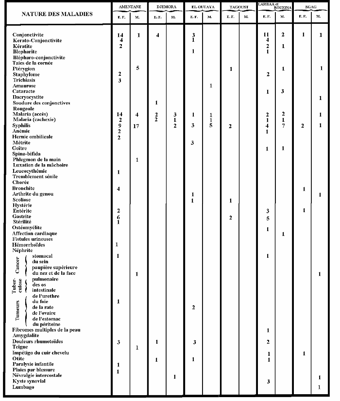 J'ai donc reconnu malades et soigné à Ménaâ cent soixante-neuf indigènes, alors qu'un plus grand nombre est venu à ma consultation; mais plusieurs n'étaient nullement atteints.