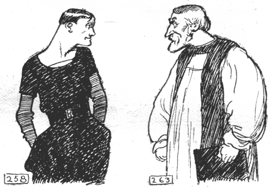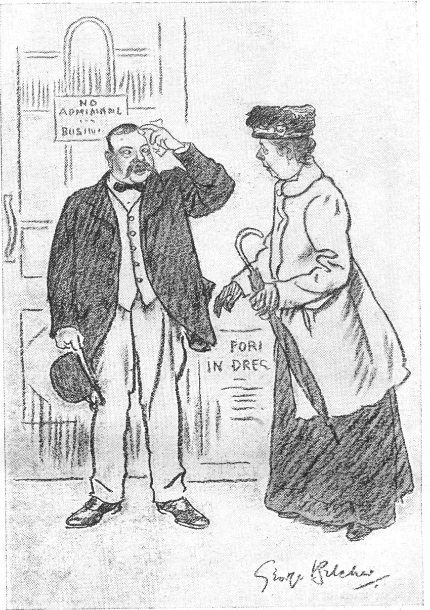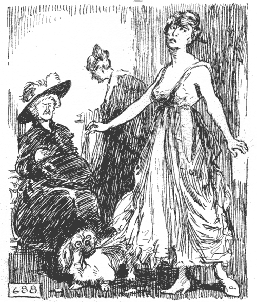 The types that came to inspect Mabel Vere were sufficiently varied. There was a masterful Colonial (finally ejected by a lady-friend, who performed a jujitsu feat which required a very palpable collusion on his part); a butler; an Army Officer (with a reputation for exploring); a gay naval thruster, and an old gentleman who ought to have known better. To most of them she opposed an air of virgin superciliousness very disappointing to their justifiable anticipations; but the butler promised copy, and she accepted an invitation to tea in his kitchen. This scene furnished some very excellent and natural fun, and there was really no need to introduce, and exploit over and over again, the hallowed device of a trip-mat, that last resort of the bankrupt farceur. The necessary complications ensued with the unexpected arrival of the master (one of the candidates for the lady's hand, I need not say), who makes sudden demand for an early dinner, a thing impossible to execute with the cook in a fit of hysterics induced by jealousy of the lady who had supplanted her in the butler's perfidious affections.