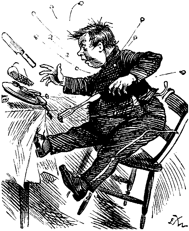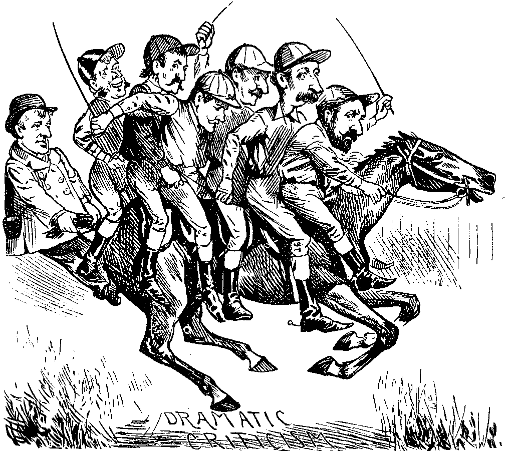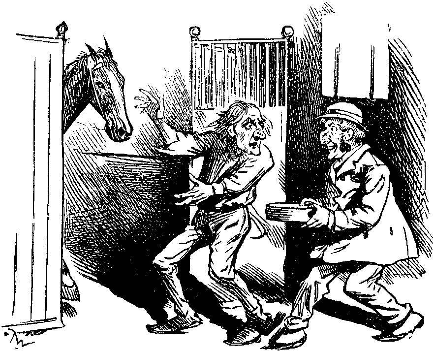 And HENRI was quite right. AUGUSTE went to work with a will, and did pull them through. He took them to the Grand National Steeple Chace, and showed them and all the world a sight the like of which they had never seen before. There were real horses, real touts, and a real winner. Oh, how it went! It was magnificent! And, before this great race, AUGUSTE (helped by HENRI this time) showed a training-stable, and how a favourite can be nobbled. It didn't in the least matter why it was done, or where it was done. It was a lovely sight to see somebody or other giving the wrong horse beans. And the horse liked them, and eat them with a zest, and felt none the worse for them. On the contrary, the beans seemed to give the creature sufficient vigour to carry on the running until Christmas at Drury Lane, with a trot to Covent Garden to follow, and then back again, perhaps to the old quarters, up to Easter.