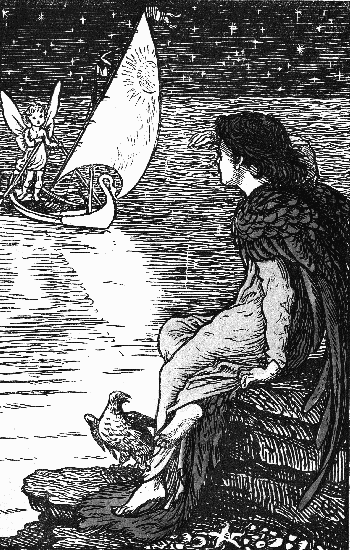 "Oh, you silly girl!" said the cuckoo. "Phil's all right, and in some ways he has a great deal more sense than you, I can tell you. Get into the boat and make yourself comfortable; lie down at the bottom and cover yourself up with the mantle. You needn't be afraid of wetting your feet a little, moon water never gives cold. There, now."